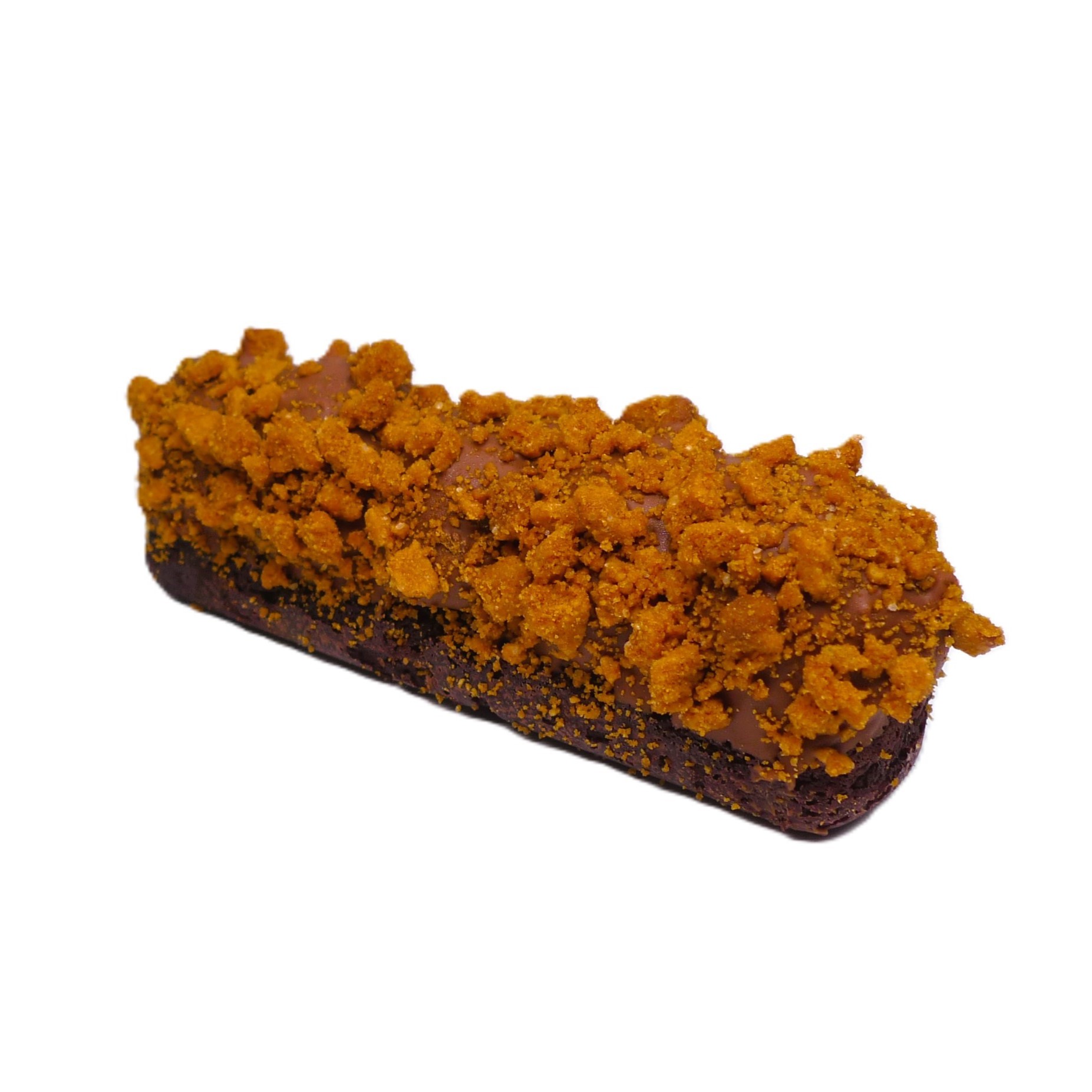 Crema de chocolate blanco sobre brownie de chocolate, cobertura de chocolate, caramelo salado y Lotus 90 g ud. caja 9/18 uds.