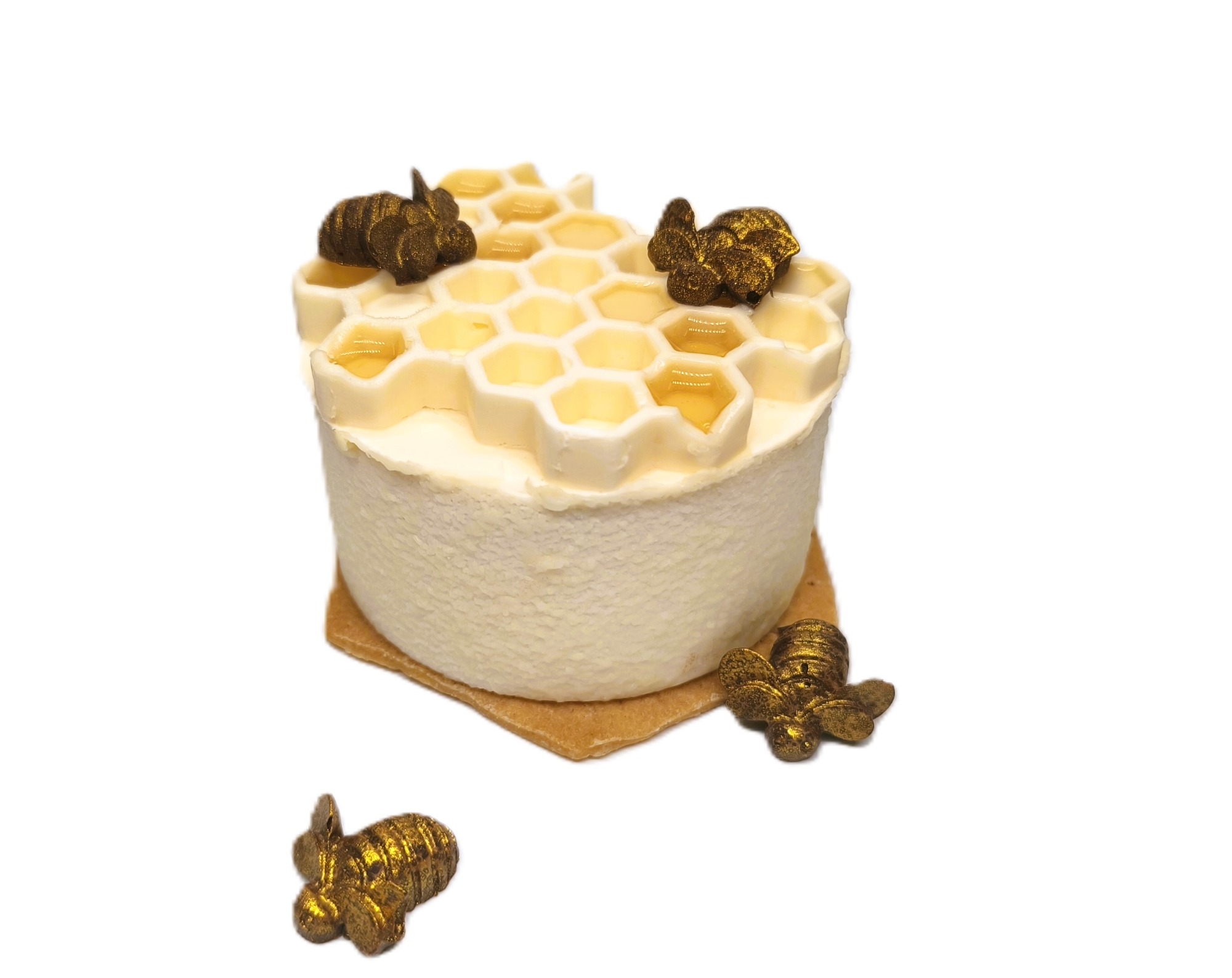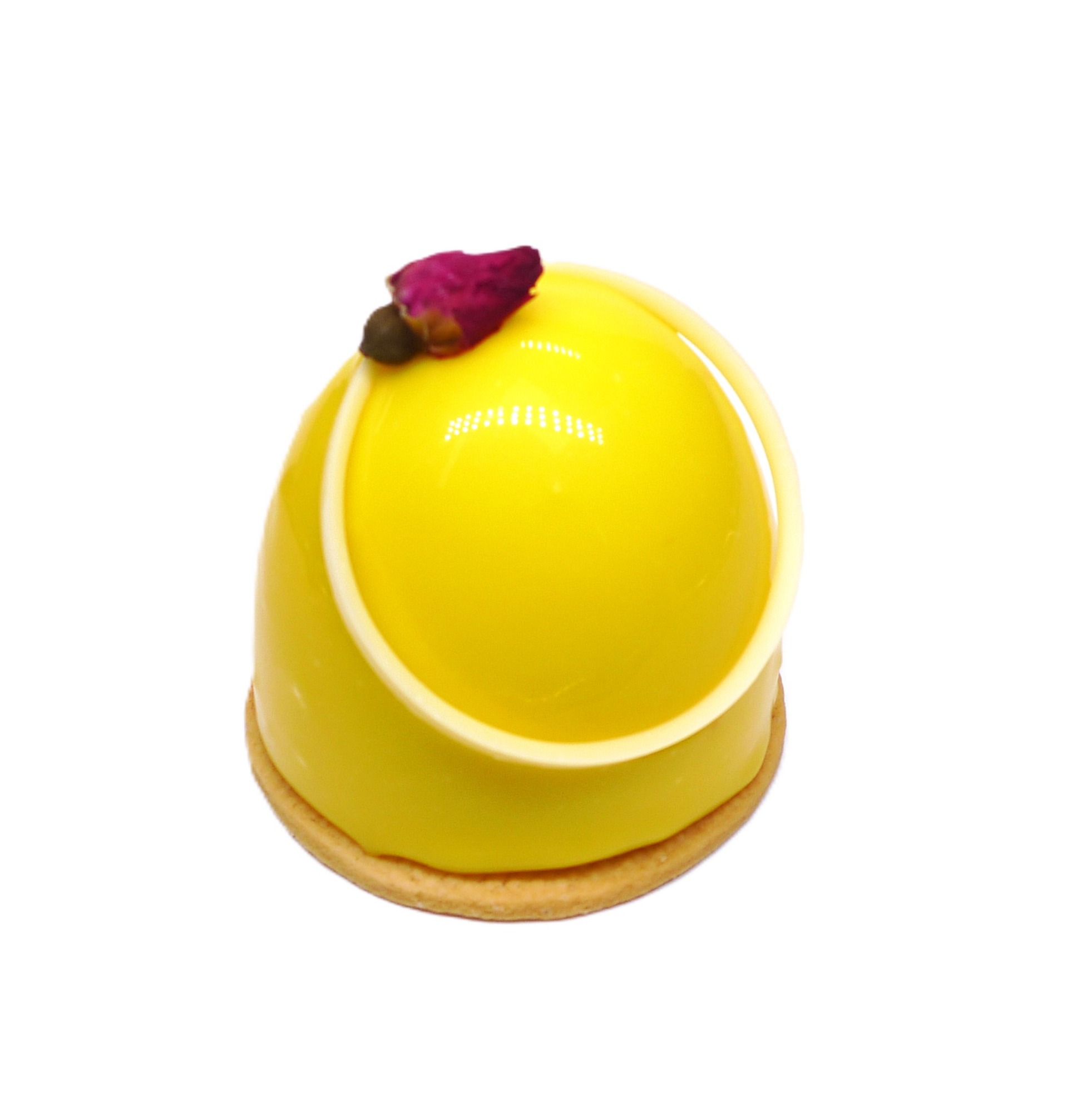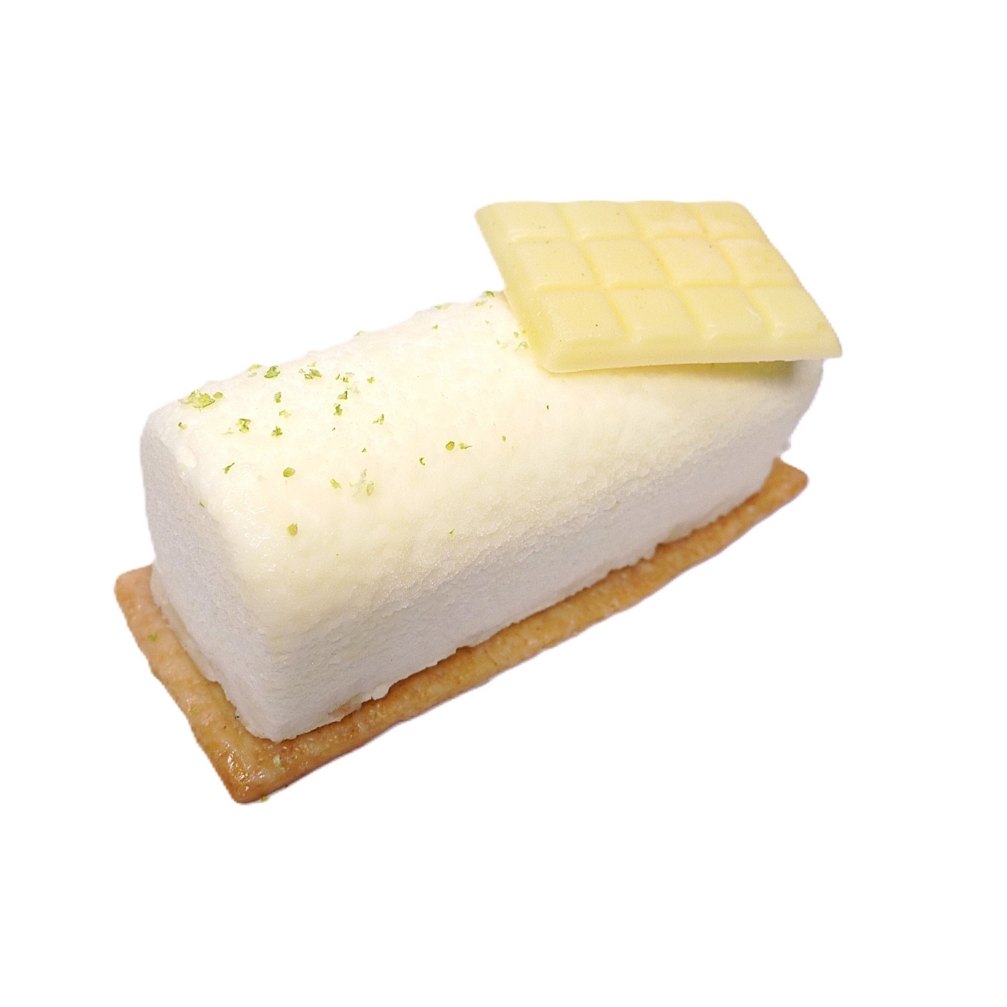 Mousse de chocolate blanco con núcleo fluido de maracuyá sobre fino bizcocho 90 g ud. Caja 10/20 uds.